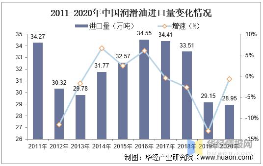 2011-2013年中国润滑油进口量呈现下降趋势,下降至2013年的29.78万吨。2013-2016年中国润滑油进口量呈现上升趋势,到2016年上升至34.55万吨。2016-2020年中国润滑油进口量又开始下跌,到2020年中国润滑油进口量下跌至28.95万吨。虽然中国润滑油进口量呈现波动变化,但整体来看,波动幅度不大。
