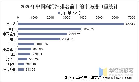 同时,从我国润滑油主要进口市场来看,2020年,我国润滑油的进口市场较为分散,其中,从新加坡进口的润滑油数量最多,达6523.7吨,占进口总量的2.3%;第二大进口市场是韩国,我国从韩国共进口了3857.25吨润滑油,占进口总量的1.3%。