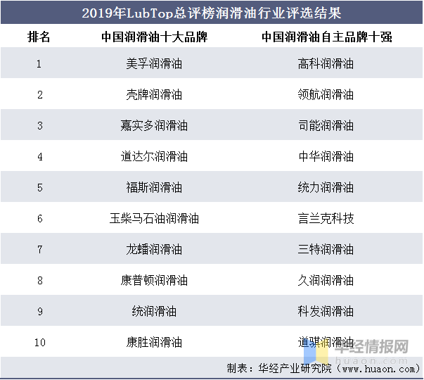 根据LubTop总评榜的信息显示,2019年,我国润滑油十大品牌基本由国外品牌占据,其中美孚、壳牌和嘉实多润滑油占据“中国润滑油十大品牌”的前三位;在自主品牌方面,高科润滑油、领航润滑油和司能润滑油占据“中国润滑油自主品牌十强”的前三位。总体来看,国外厂商在我国润滑油市场的竞争力更强,而国产品牌也正逐渐提升竞争力,消费者的认可度也逐步提升。