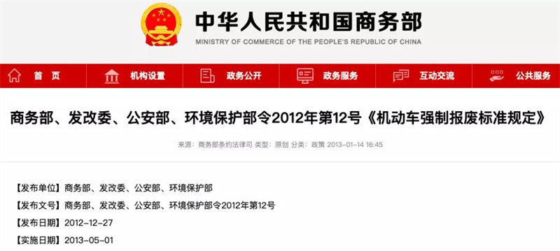2012年12月,商务部就发布《机动车强制报废标准规定》。《规定》指出:从2013年5月1日起来,对私家车15年的报废年限给予正式取消。