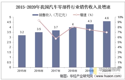 汽车零部件作为汽车整车企业的上游,与汽车行业具有较高的相关性。近几年,随着汽车保有量不断提升,以及零部件市场的不断扩大,我国汽车零部件行业年销售收入规模由2015年的3.2万亿元增长至2020年的4.6万亿元,2015-2020年CAGR为7.3%。