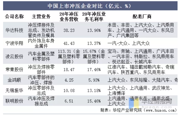 第三方的冲压企业数量众多,以民营企业为主,已上市的公司(或其子公司)主要包括华达科技、凌云股份、宁波华翔、常青股份、金鸿顺、无锡振华和联明股份等,未上市企业数量更多,规模更小,比如合肥亿恒、安徽福达、安徽大洋、重庆大江信达、无锡全盛安仁等。