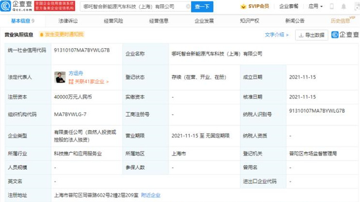 【注册金4亿元哪吒汽车于上海成立新公司】