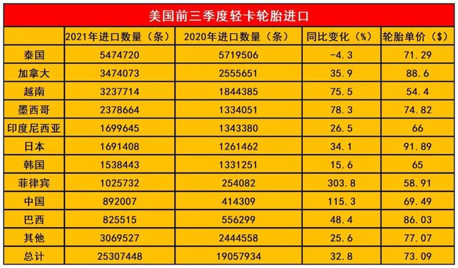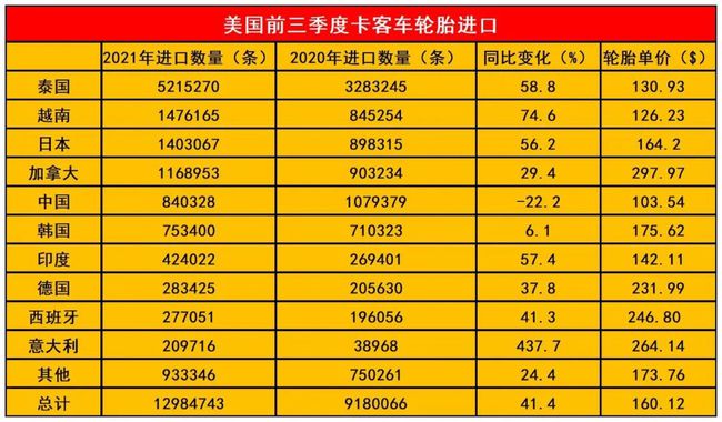 数据显示,美国前三季度进口乘用车轮胎11455万条轮胎,同比增长16.5%,泰国仍然为美国最大的轮胎进口国。