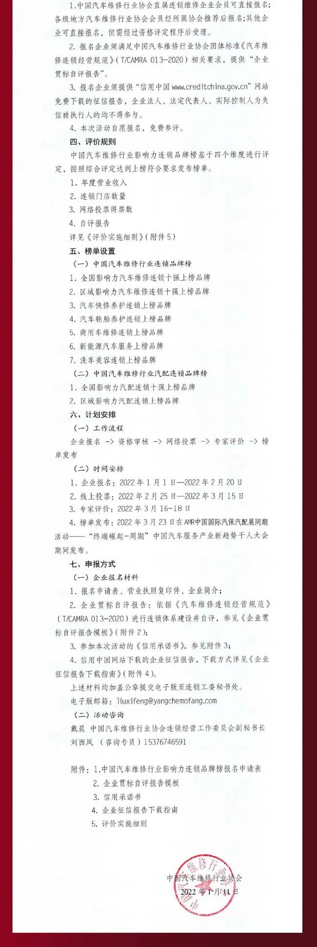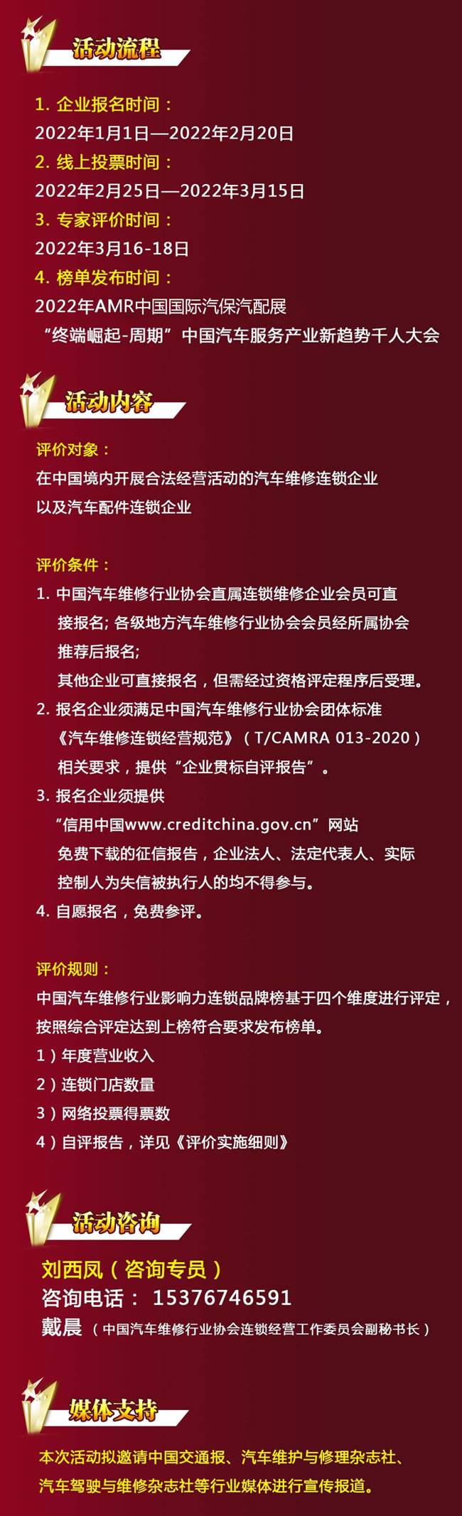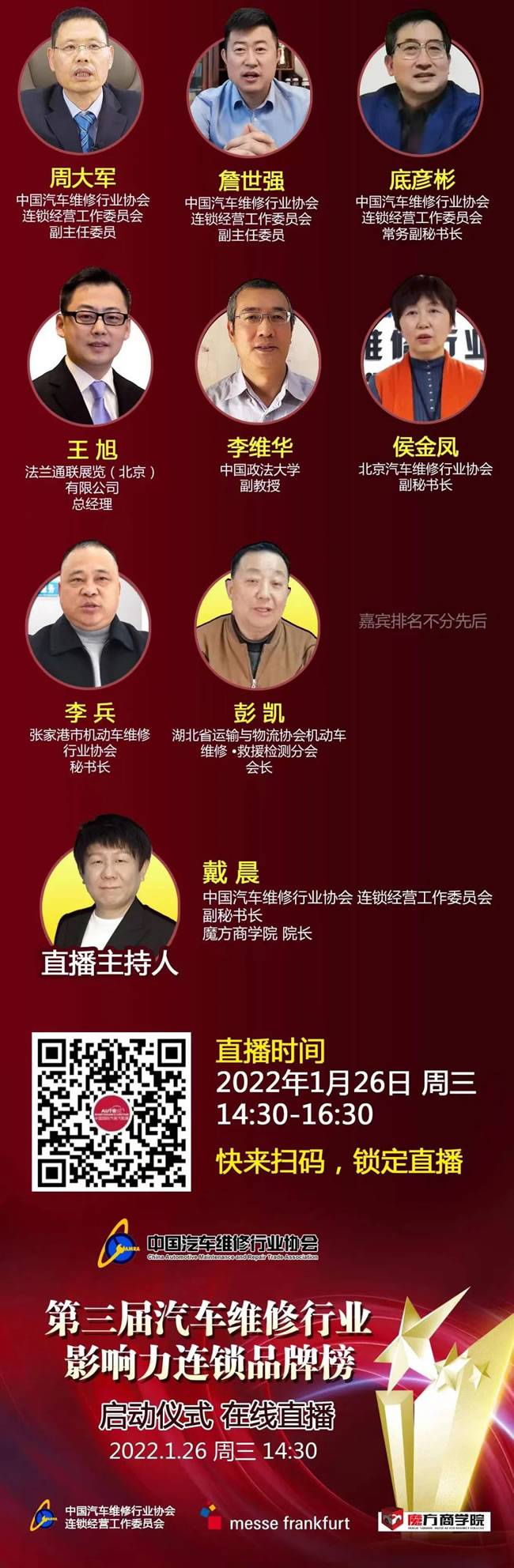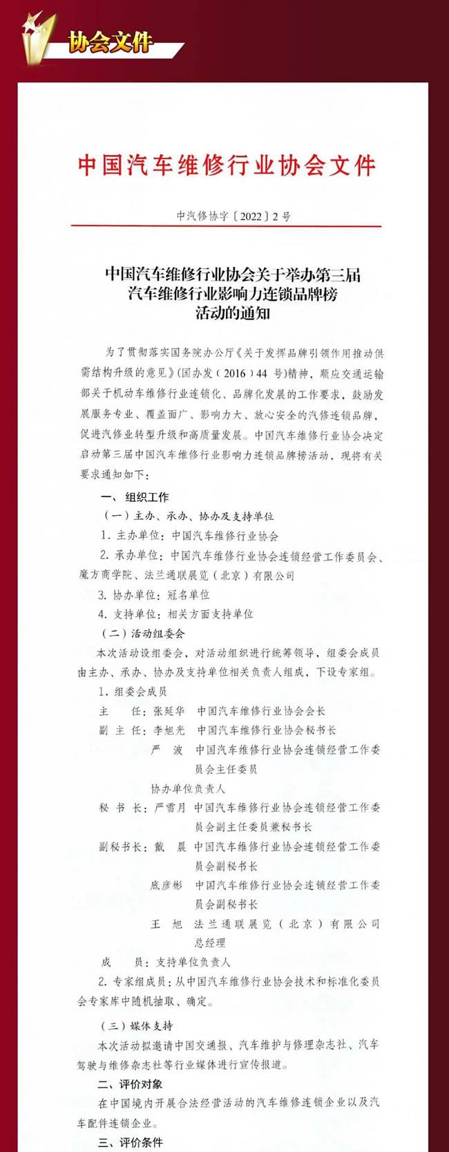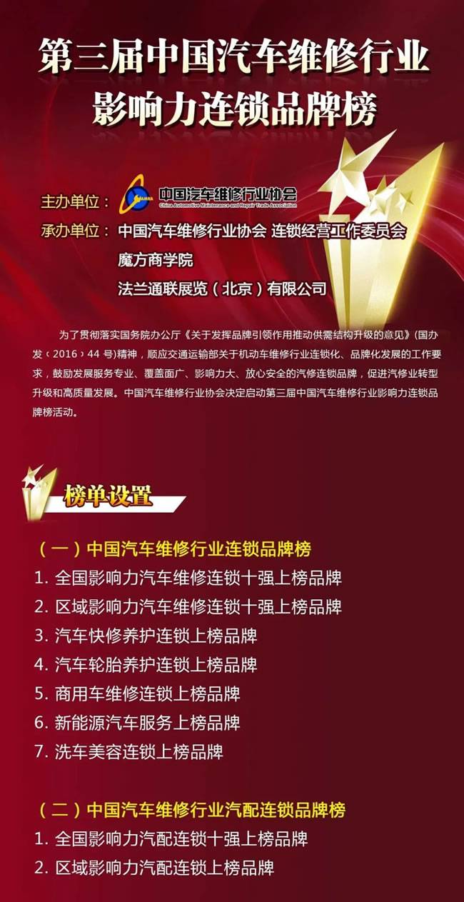 为促进汽修连锁品牌的高质量发展,由中国汽车维修行业协会主办,中国汽车维修行业协会连锁经营工作委员会、魔方商学院、法兰通联展览(北京)有限公司承办的:第三届中国汽车维修行业影响力连锁品牌榜,正式启动。