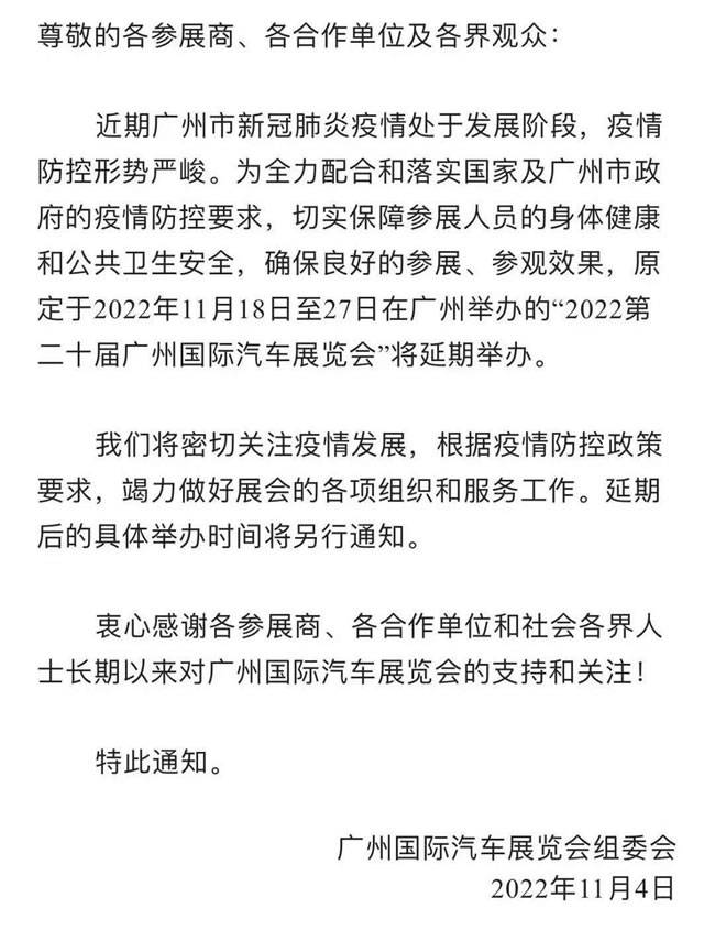 11月4日,广州国际汽车展览会组委会发布公告称,为落实疫情防控要求,原定于2022年11月18-27日在广州举办的“2022第二十届广州国际汽车展览会”将延期举办,延期后的具体举办时间将另行通知。