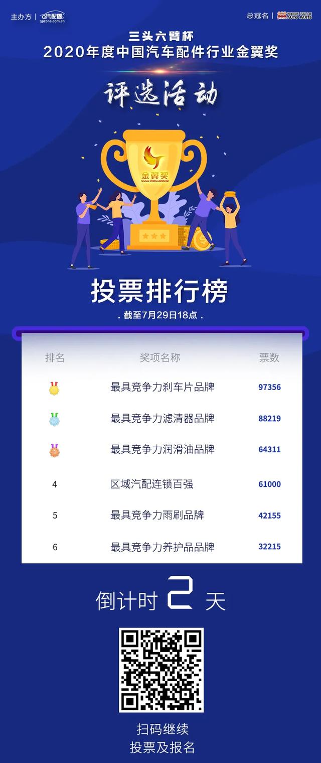 本次投票活动截止到7月31日!请大家抓紧时间投票,最终结果将在8月28日,由汽配圈主办、三头六臂独家冠名的三头六臂杯·2020(第五届)中国汽车配件行业品牌大会暨金翼奖颁奖盛典上进行公布!