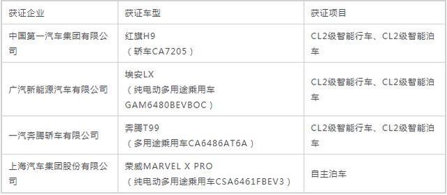 此次发布共有四家企业的四个车型分别通过了CL2级智能行车、CL2级智能泊车和自主泊车的测试和审核,获得了相应的认证证书,具体获证情况详见下表。