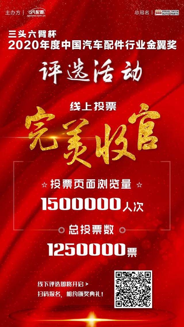 经过5天激烈角逐,备受瞩目的三头六臂杯·2020中国汽车配件行业金翼奖网络投票通道已全线关闭,据投票截止时统计,此次网络总投票数突破125万次,浏览量突破150万人次。