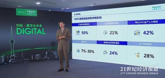 而宁德时代首席制造官、副总裁倪军在当天的峰会上发表演讲时介绍,宁德时代通过智能制造,产品研发周期下降了50%,企业运营成本降低了21%,单位GWh生产人力降低42%,质量改进了7%-30%,资源综合利用率提高了24%,生产效率提高了28%。