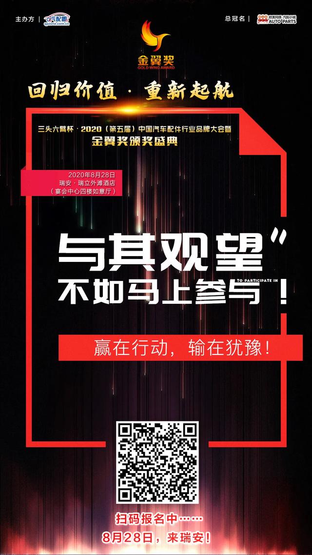 2020年8月28日,由汽配圈主办、三头六臂独家冠名的“三头六臂杯·2020(第五届)中国汽车配件行业品牌大会暨金翼奖颁奖盛典”将于8月28日在瑞安·瑞立外滩酒店隆重举办。