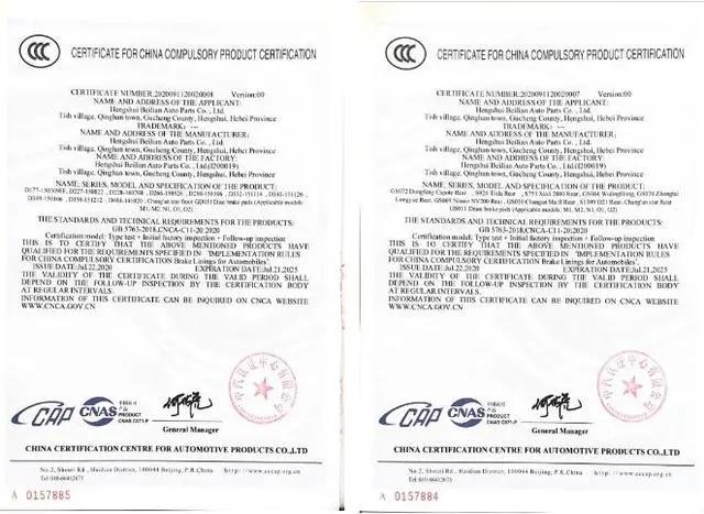自国务院发文明确汽车用制动器衬片产品(刹车片)即将转为强制性产品认证(CCC)管理后,嘉联达刹车片为熟悉和理解CCC认证工作,近期委托中汽认证中心有限公司进行了专业、系统的培训。并严格按照实施规则的要求,进一步完善公司体系文件管理,提高了产品质量保证能力,进行了自查自纠和整改,顺利通过CCC认证。