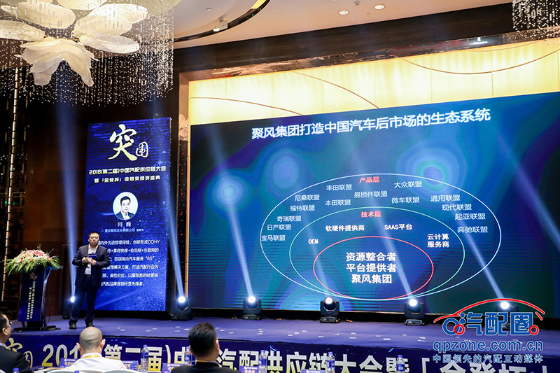 这里讲的云生态,我待会儿给大家尝试一下,什么叫云生态。聚风我们将是未来资源整合者,在2013年的时候我们整合了后市场整个的动力体系,快速的通过资源整合作为行业的领导者。今天我们拥有SaaS平台,我们拥有硬件设施。我们会希望通过资源整合把大家连串在一起,提供全部产品的解决方案。在今天的配件里面没有哪一个人把全车件做好,所以我们将把整个的车系板块进行大结合,大变革。