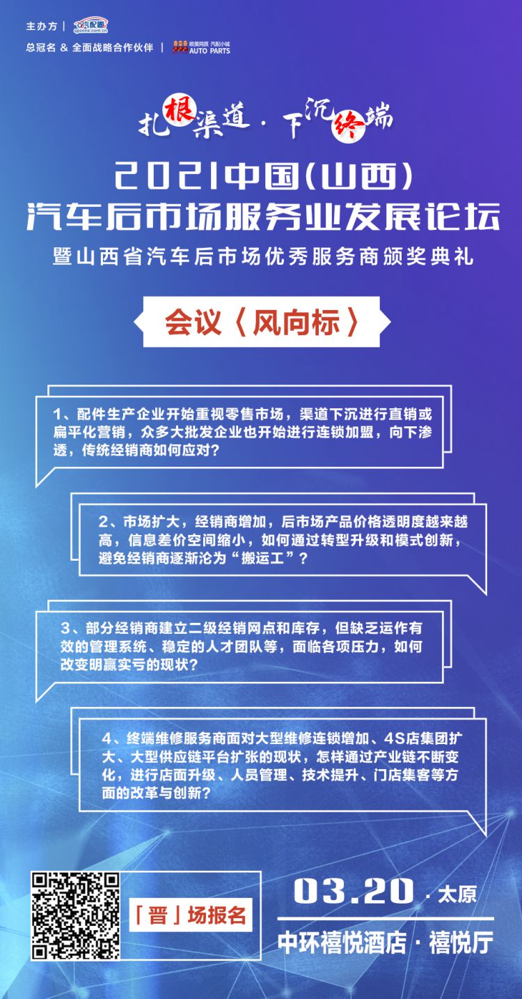 2021年3月20日,由汽配圈主办的“2021中国(山西)汽车后市场服务业发展论坛暨山西省汽车后市场服务商颁奖典礼”将在山西省会太原盛大举办,论坛以“扎根渠道,下沉终端”为主题,基于山西市场强大的需求及服务潜力,对全省渠道商及终端维修服务商进行整合,联合后市场不同品类优质产品及盈利项目,进行优秀服务商表彰及市场最优产品推介,连接供需双方,打造平台,实现沟通零距离,为山西市场发展提供更多新模式、新项目、新机遇。