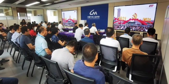 2021年7月1日上午,为热烈庆祝中国共产党百年华诞,中国汽车工业协会党支部组织全体党员干部员工收听收看在天安门广场隆重举行的“庆祝中国共产党成立100周年大会”现场直播;召开庆祝建党100周年会议。党支部书记、常务副会长兼秘书长付炳锋、党支部委员、领导班子成员等出席会议,党支部委员、副秘书长刘宏主持会议。
