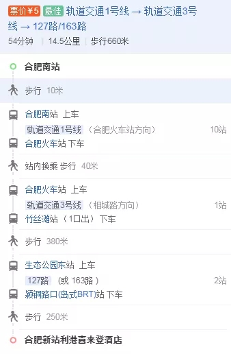 合肥南站:轨道交通1号线合肥南站上车→合肥火车站(10站)下车→轨道交通3号线合肥火车站上车→竹丝滩站(1站)下车→127(或163)路生态公园东站上车→颖铜路口(岛式BRT)站下车→合肥新站利港喜来登酒店