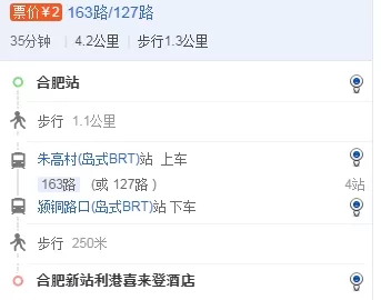 合肥站:127(或163)朱高村(岛式BRT)上车→颖铜路口(岛式BRT)站下车→合肥新站利港喜来登酒店