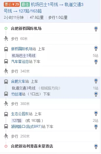合肥新桥国际机场:机场巴士1号线新桥国际机场站上车→汽车客运总站(5站)下车→轨道交通3号线合肥火车站上车→竹丝滩站(1站)下车→127(或163)路生态公园东站上车→颖铜路口(岛式BRT)站下车→合肥新站利港喜来登酒店