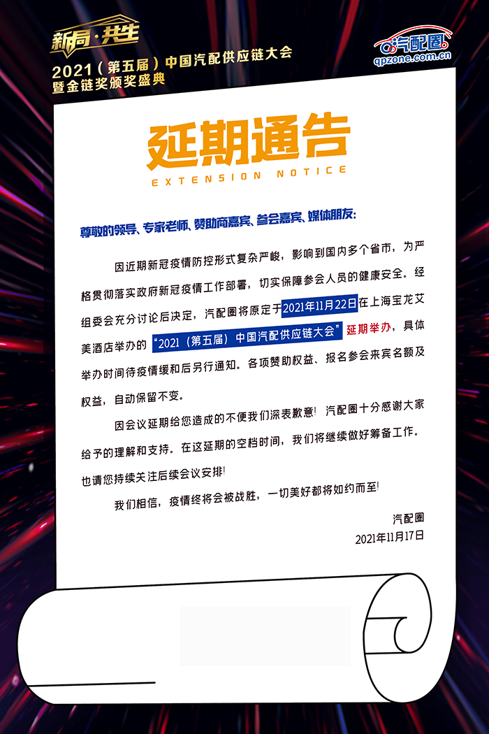 因近期新冠疫情防控形式复杂严峻,影响到国内多个省市,为严格贯彻落实政府新冠疫情工作部署,切实保障参会人员的健康安全。经组委会充分讨论后决定,汽配圈原定于2021年11月22日在上海宝龙艾美酒店举办的“2021(第五届)中国汽配供应链大会”将延期举办,具体举办时间待疫情缓和后另行通知。各项赞助权益、报名参会来宾名额及权益,自动保留不变。