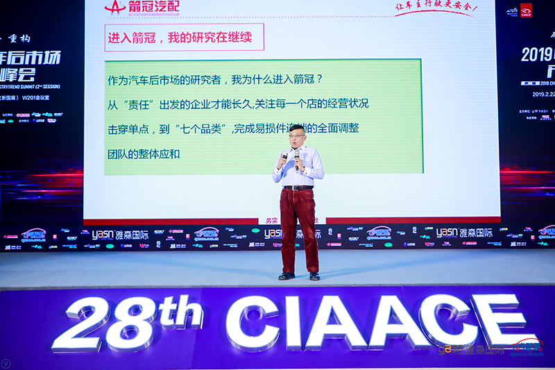 我上一个任职的职务是十二年前,我在企业里担任总经理,这次由于之前和监管做了项目上的合作,接近一年时间,做修理厂赋能。经过接近一年时间的交往,我对监管的企业文化有了越来越深入的认识,也慢慢地被箭冠的企业文化所吸引,我在这里找到了一个更加合适的研究土壤。今天有幸代表张总,也感谢雪松总给我这样一个机会,能够来和大家分享关于我们箭冠在自己的商业模式探讨中的特色,一方面如果大家能够有所收益,那是我的希望,如果有不足之处,也欢迎大家拍砖、批评。