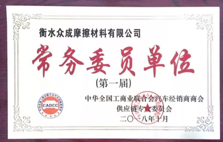 热烈祝贺衡水众成摩擦材料有限公司荣膺“中华全国工商业联合会汽车经销商商会供应链专业委员会”第一届常务委员单位。