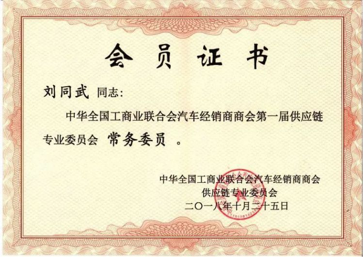众成刹车片营销总监刘同武先生担任“中华全联车商第一届供应链专业委员会”常务会员。
