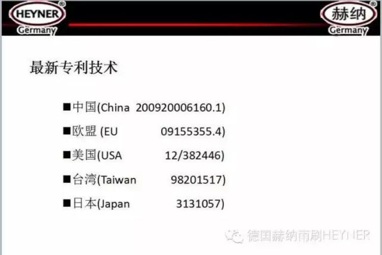 德国赫纳雨刷设计已申请中国、欧盟、美国、台湾、日本等国家和地区的专利。