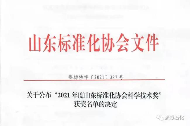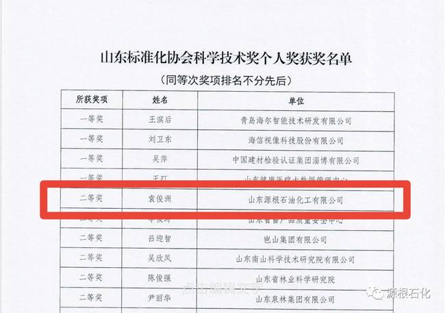 12月28日,山东标准化协会公布了“2021年度山东标准化科学技术奖”获奖名单。山东源根石油化工有限公司(以下简称:源根石化)公司总工程师袁俊洲凭借公司在标准化方面的突出表现,荣获“山东标准化协会科学技术奖个人二等奖”!