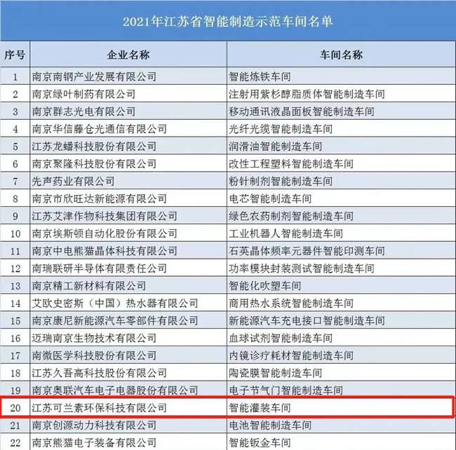 近日,江苏省工业和信息化厅、江苏省财政厅联合发布关于公布2021年江苏省智能制造示范车间名单的通知,可兰素智能灌装车间榜上有名,正式列为2021年江苏省智能制造示范车间。