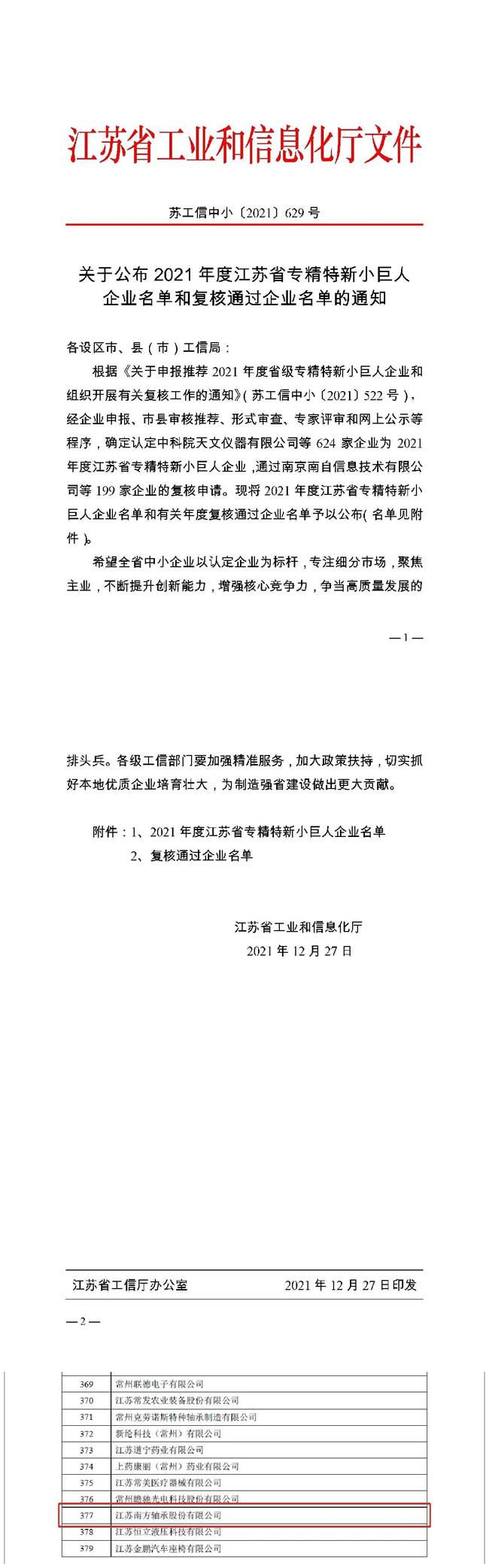 12月28日,2021年度江苏省“专精特新”小巨人企业认定名单公布,南方轴承荣登榜单。近两年,“专精特新”作为一个热词被频繁提及,“专精特新”其实就是创新型企业专业化、精细化、特色化和新颖化四个特征的合并名词。