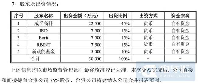 威孚高科表示,公司将以自有资金出资22500万元(占比45%),IRD出资7500万元(占比15%),Borit出资7500万元(占比15%),RBINT出资7500万元(占比15%),新动能基金出资5000万元(占比10%)。本次交易完成后,公司直接和间接持有合资公司75%股权,合资公司将会纳入公司合并报表范围。