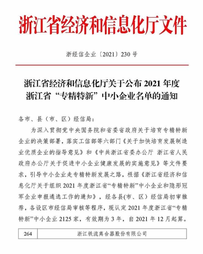 近日,根据浙江省经济和信息化厅近期发布的《关于公布2021年度浙江省“专精特新”中小企业名单的通知》,铁流股份被认定为2021年度浙江省“专精特新”中小企业。