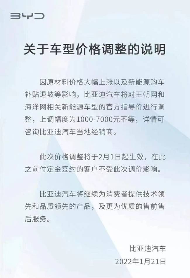 1月21日,比亚迪汽车官方发布关于车型价格调整说明,称因为原材料价格大幅上涨以及新能源购车补贴退坡等影响,其将于2月1日起对王朝网和海洋网相关新能源车型的官方指导价进行调整,上调幅度为1000-7000元不等,在此之前付定金签约的用户不受此次调价影响。