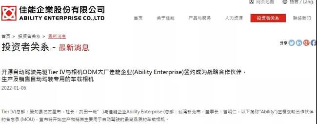 那么,佳能企业股份有限公司是一家什么样的公司?记者查询其官方网站,在首页上发现了该公司与开源自动驾驶公司Tier IV合作的消息。至此,记者找到了网上截图的真正出处。