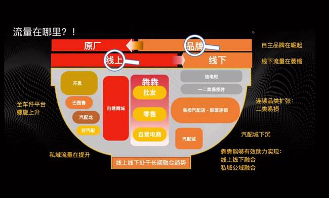 第二点,随着互联网技术的普及,线上线下流量的比重在发生大转变,之前很多东西是以传统的方式在线下执行,但这几年不管是全车件还是易损件,已经把流量走到了线上,线下的流量在逐渐萎缩,实体店受到影响,线上成为趋势,各全车件平台在不断地发展,一些成长起来了,一些还在螺旋上升,或者是在寻找自己的模式中。