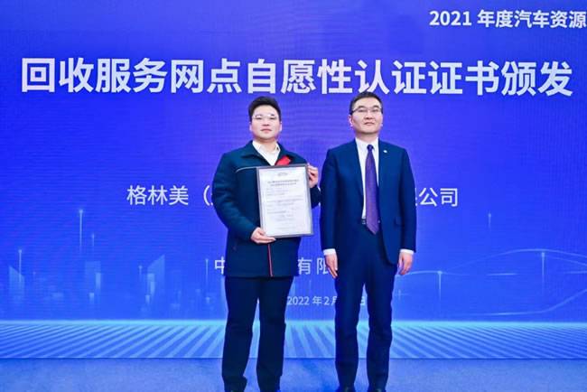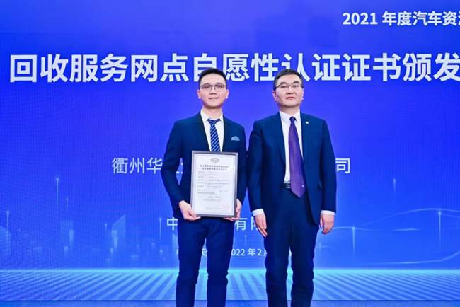 2022年2月22日,在“2021年度汽车资源综合利用研究成果分享会”上,中汽研华诚认证(天津)有限公司(以下简称“华诚认证”)副总经理张宇为衢州华友资源再生科技有限公司、格林美(无锡)新能源服务有限公司、江西睿达新能源科技有限公司颁发了首批动力蓄电池回收服务网点建设及运营管理体系认证证书。