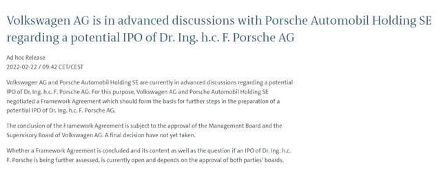 22晚间,多家媒体报导豪车品牌保时捷正在谋求从大众集团脱离,试图独立在德国上市的传闻,随后,大众集团发布声明证实了这一消息。声明中称,大众汽车和保时捷控股已经达成了一项协议,协议中明确保时捷汽车将会独立上市,但最终需要大众汽车和保时捷控股董事会的签署后才可以继续推进。华尔街预计,如果保时捷汽车最终得以独立,估值约为600亿至850亿欧元之间,而整个大众集团目前的市值约为1120亿欧元,接近再造一家大众公司,这可能会成为欧洲最大的IPO之一。