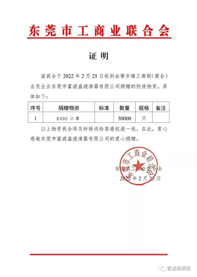 捐赠的KN95口罩是富滤盛集团旗下的广东国滤净化科技有限公司生产,资质齐全,符合出口标准,在富滤盛集团的紧急调动下,2月25日下午,富滤盛集团捐赠的50000个KN95口罩顺利送达东莞市总商会大厦。