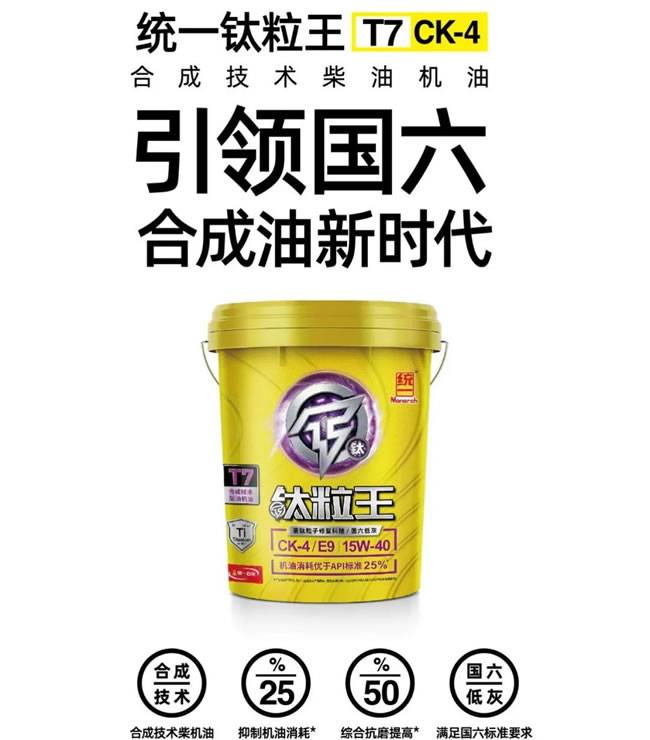 以钛粒王T7 CK-4为例,该产品采用合成技术基础油,具有灰分低、碱值高等特点,使用中能保持超强的酸中和能力,不但能够抑制油泥、烟炱,确保发动机部件清洁、抗磨、抗腐蚀,还能与尾气后处理设备具有良好的兼容性,产生更少的PM颗粒,避免DPF堵塞或故障,减碳效果进一步提升。可满足整车综合工况4万-6万公里长效使用,从而达到更低排放、更长里程、更高性能。