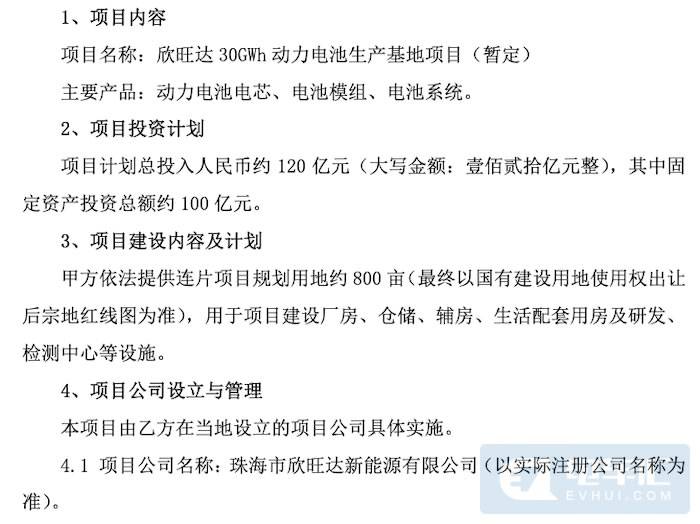 公告显示,珠海市政府将动力电池产业作为当地重点发展产业,为欣旺达生产项目落户提供相关政策支持和综合配套服务,拟提供连片项目规划用地约800亩。欣旺达将在珠海设立项目公司,实缴注册资本金30亿元。