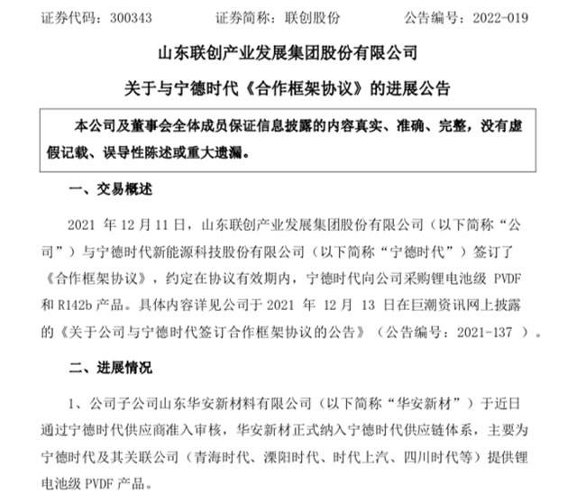 3月2日,联创股份发布公告称,公司子公司山东华安新材料有限公司(以下简称“华安新材”)于近日通过宁德时代供应商准入审核,华安新材正式纳入宁德时代供应链体系,主要为宁德时代及其关联公司(青海时代、溧阳时代、时代上汽、四川时代等)提供锂电池级PVDF(聚偏氟乙烯,是锂电池最常用的正极粘结剂)产品。