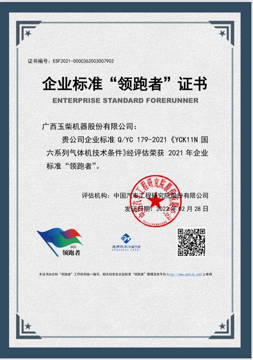近日,玉柴凭借企业标准Q/YC 179-2021《YCK11N国六系列气体机技术条件》荣获2021年企业标准“领跑者”证书。