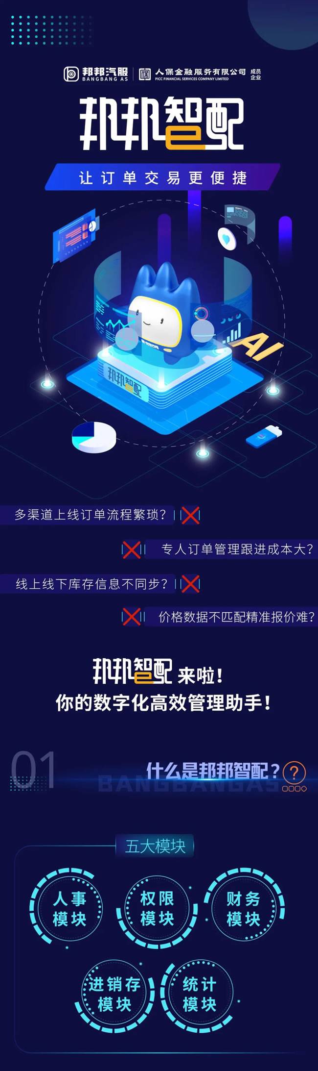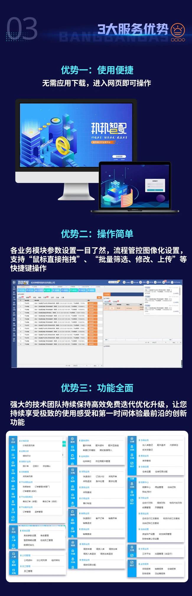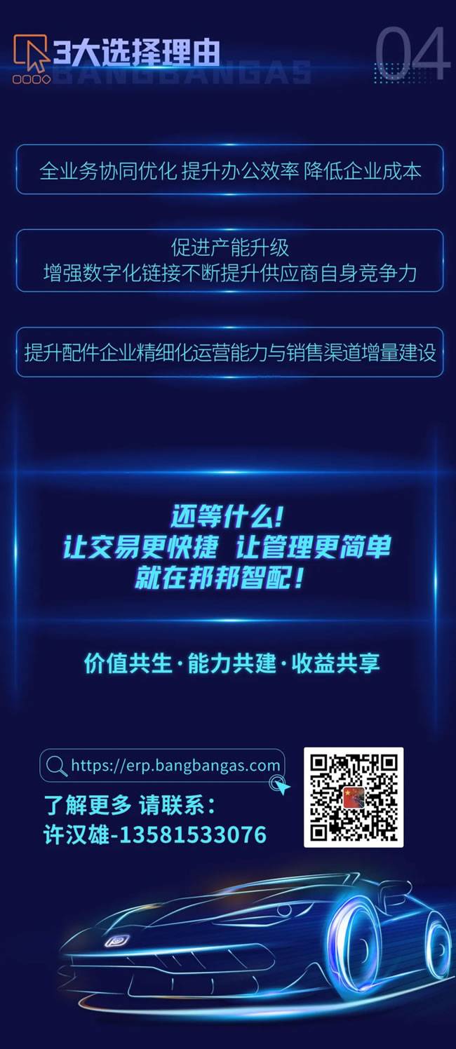 邦邦智配是邦邦汽服基于行业主流进销存系统开发的配件商ERP运营平台,集“进、销、存、财”四位一体,可满足配件商自主业务的日常需要,并围绕驾安配平台业务开发定制化服务,为优质供应商打造全业务链条线上化、智能化、自动化的ERP管理解决方案,助力配件商实现订单快速交易与精细化管理,提升企业运营效率。