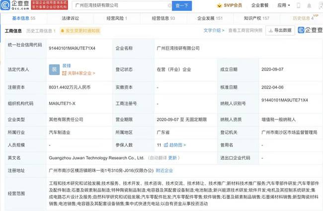 实际上,巨湾技研是广汽集团的子公司。据其官网,巨湾技研是广汽集团首家内部孵化的首家混合所有制高科技民营企业,由广汽集团、广汽资本、广汽研究院先导技术团队与第三方战略伙伴持股平台共同出资。