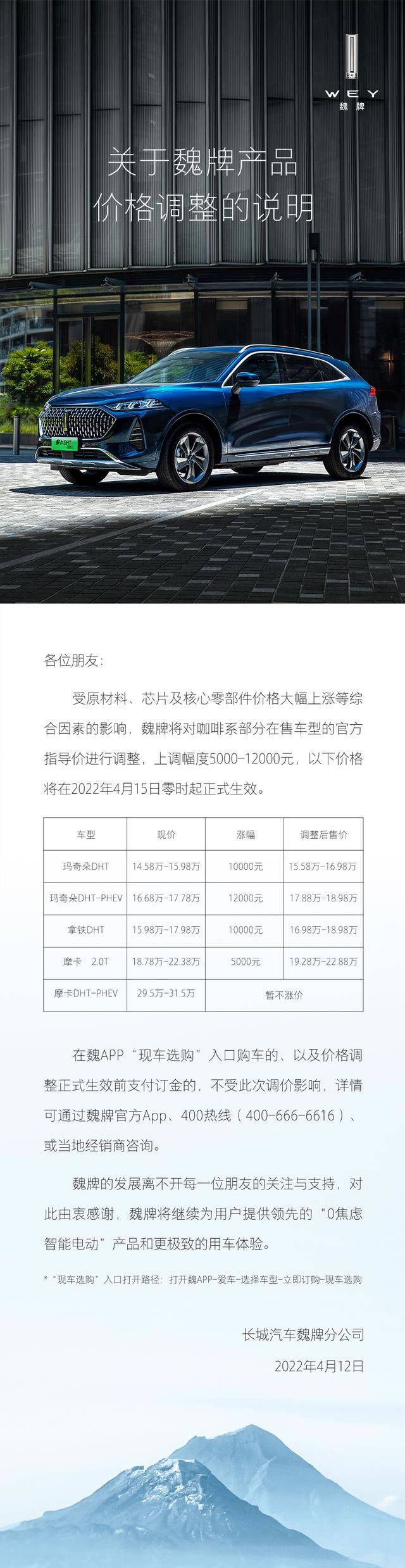 说明提到,受原材料、芯片及核心零部件价格大幅上涨等综合因素的影响,魏牌将对咖啡系部分在售车型的官方指导价进行调整,上调幅度5000-12000元,将在2022年4月15日零时起正式生效。其中,玛奇朵-DHT-PHEV涨幅最高,现价达16.68-17.78万元。