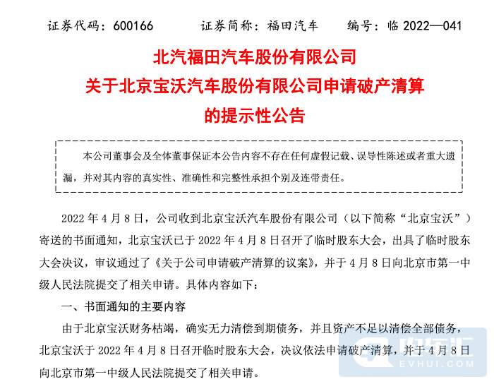 由于北京宝沃财务枯竭,确实无力清偿到期债务,并且资产不足以清偿全部债务,北京宝沃于2022年4月8日召开临时股东大会,决议依法申请破产清算,并于当天向法院递交了相关申请。