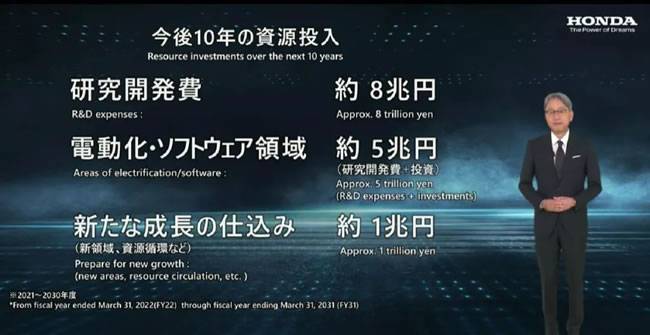 4月12日,本田召开汽车电动化业务说明会,宣布未来十年将在电动化和软件领域投入5万亿日元(约合人民币2535亿元),其中3.5万亿日元(约合人民币1775亿元)用于研发,1.5万亿日元(约合人民币760亿元)用于投资。