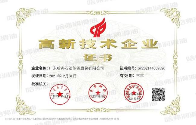 近日,广东哈弗石油能源股份有限公司再次荣获由“广东省科学技术厅”、“广东省财政厅”、“国家税务总局广东省税务局”颁发的“高新技术企业”证书,这是哈弗润滑油继2016年荣获国家“高新技术企业”称号后,再次获此殊荣,也是哈弗公司综合实力的体现,为哈弗公司在创新道路上继续添加新动力。