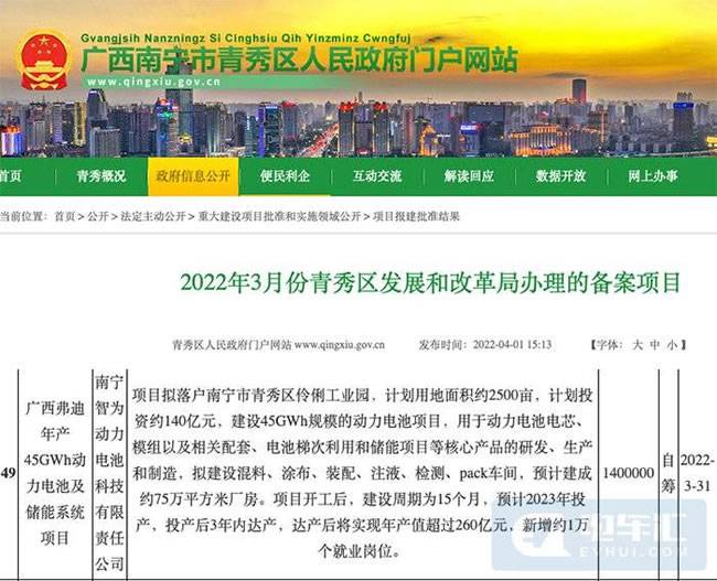 近日,广西南宁市青秀区人民政府公布《2022年3月份青秀区发展和改革局办理的备案项目》公告。公告显示,比亚迪旗下广西弗迪年产45GWh动力电池及储能系统项目拟落户南宁市青秀区伶俐工业园,计划用地面积约2500亩,计划投资约140亿元,建设45GWh规模的动力电池项目,用于动力电池电芯、模组以及相关配套、电池梯次利用和储能项目等核心产品的研发、生产和制造,拟建设混料、涂布、装配、注液、检测、pack车间,预计建成约75万平方米厂房。项目开工后,建设周期为15个月,预计2023年投产,投产后3年内达产,达产后将实现年产值超过260亿元,新增约1万个就业岗位。