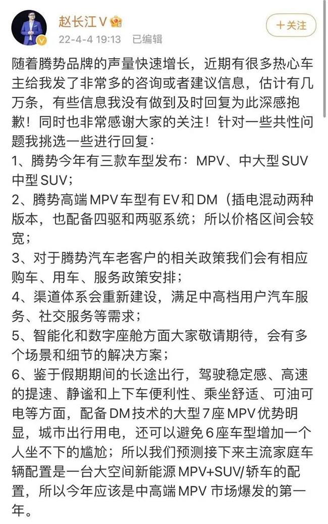 而事实上,此次的曝光已经不是今年以来赵长江首次在社交平台上发布腾势汽车的动态了。在同年的2月23日,赵长江就曾在微博上发布了一组腾势高端MPV的谍照,随后3月20日,赵长江又透露:腾势新的APP正在开发中,将实现销售、车控、社区等功能、LOGO有新优化等多种信息,这也不难怪众多网友调侃道:“一直在边缘市场徘徊的腾势汽车终于有了新动向了。”